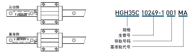 當(dāng)非互換型直線導(dǎo)軌配對(duì)使用時(shí),需注意基準(zhǔn)軌與從動(dòng)軌之差異?;鶞?zhǔn)軌側(cè)邊基準(zhǔn)面精度較從動(dòng)軌高,可作為床臺(tái)安裝承靠面?;鶞?zhǔn)軌上有刻上MA之記號(hào),如圖所示。