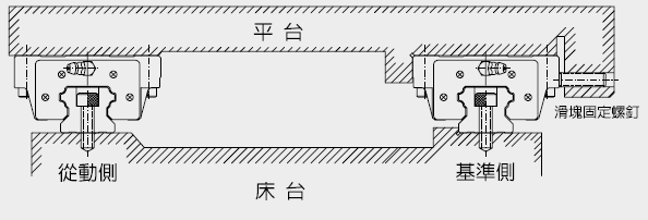 將基準(zhǔn)側(cè)線軌的兩個滑塊及從動側(cè)線軌其中一個滑塊固定于平臺,再將從動側(cè)的導(dǎo)軌及其另一個滑塊約略分別固定于床臺及平臺,以基準(zhǔn)側(cè)導(dǎo)軌為準(zhǔn)移動平臺,從導(dǎo)軌一端開始,邊確認(rèn)從動側(cè)直線導(dǎo)軌的滾動阻力,邊依序以特定的扭力鎖緊裝配螺絲。