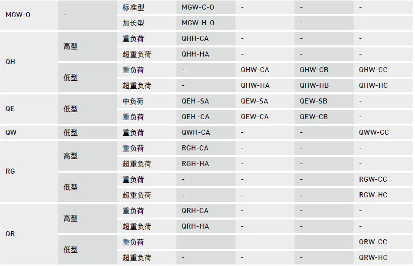 為服務(wù)客戶因應(yīng)其對產(chǎn)品多樣性的需求,除了適用一般工具機(jī)產(chǎn)業(yè)的HG系列外,更研究開發(fā)出較適合自動化產(chǎn)業(yè)的EG系列以及適合于單軸設(shè)備使用的WE/QW系列;且研究開發(fā)出適合高剛性需求產(chǎn)業(yè)的RG/QR系列及微小型機(jī)械半導(dǎo)體產(chǎn)業(yè)適用之MGN/MGW系列;并針對高科技產(chǎn)業(yè)研究開發(fā)出具有高速、寧靜、低發(fā)塵需求的QH/QE系列產(chǎn)品。