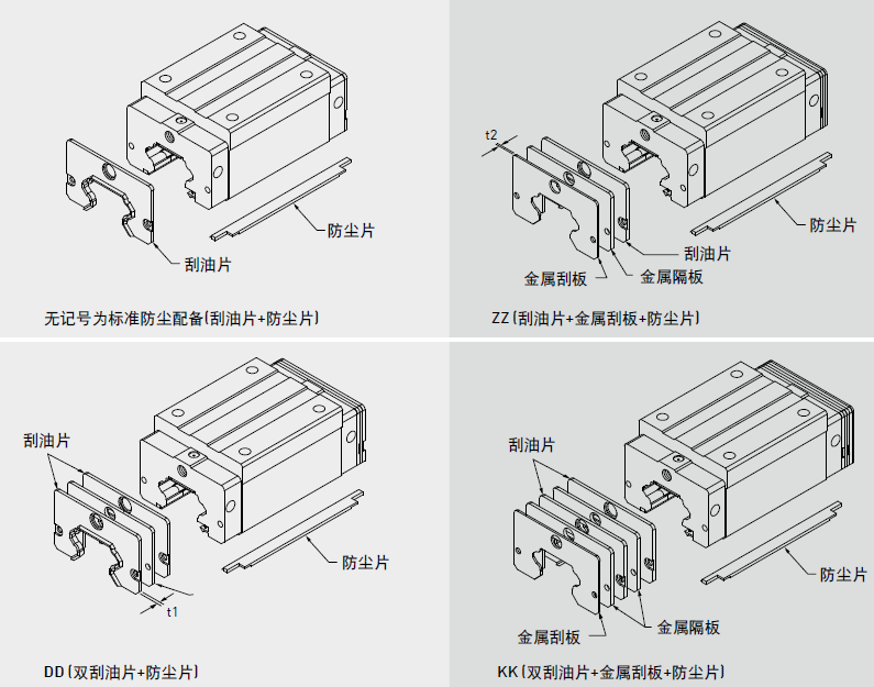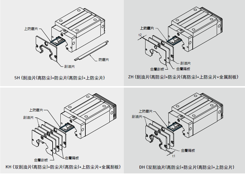 HIWIN特別針對具有粉塵顆粒之嚴苛作業(yè)環(huán)境,如木工機械、玻璃/石墨加工等設備,開發(fā)具有超高防塵功能之特殊配件,實現(xiàn)超高防塵性能。若有下列高防塵配件需求時,請于產品型號后面加注代碼。