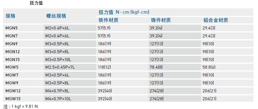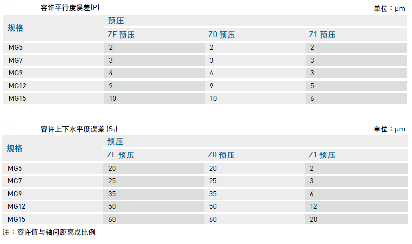 微型滾珠直線導(dǎo)軌MG系列安裝平面誤差對照表