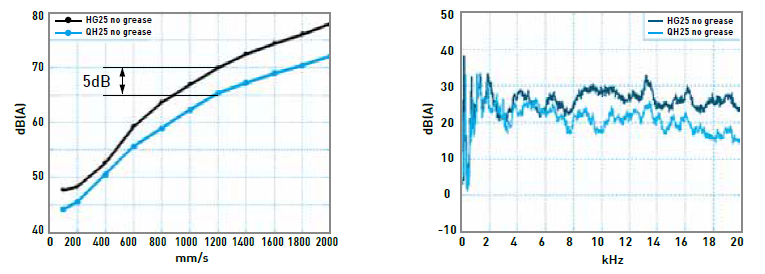 利用同步聯(lián)結(jié)器可使?jié)L珠均勻等間隔的排列,滾珠與滾珠間的相互撞擊金屬聲消失,尖銳的高頻聲音強(qiáng)度有效降低(見右下圖)??偤偷穆曇魪?qiáng)度與舊有系列比較在各個(gè)速度域有效降低約5分貝(見左下圖)。
