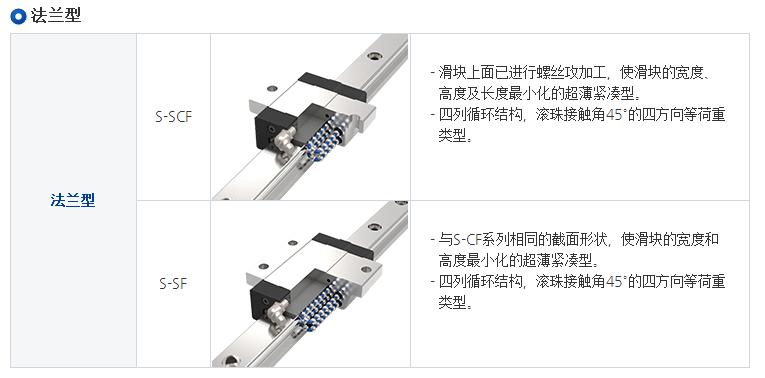 S系列使用四列鋼珠承受負(fù)荷設(shè)計(jì),使其具備高剛性、高負(fù)荷的特性,同時(shí)具備四方向等負(fù)載特色、及自動(dòng)調(diào)心的功能, 可吸收安裝面的裝配誤差,得到高精度的訴求。 加上降低組合高度及縮短滑塊長度,非常適合高速自動(dòng)化產(chǎn)業(yè)機(jī)械及空間要求的小型設(shè)備使用。