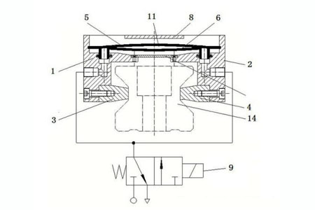 1、右座體 2、左鎖緊片 3、右鎖緊片 4、上彈簧鋼片 5、下彈簧鋼片 6、彈簧片 7、限位凸臺 8 和電磁閥 9,左座體和右座體相對鏡像設(shè)置,左座體和右座體上方中心設(shè)有限位凸臺 8,左座體 1 和右座體 2 經(jīng)彈簧片 7 固定連接,左座體 1 和右座體 2 上端中心設(shè)有彈簧鋼片腔 12,下端中心設(shè)有線軌滑塊移動腔 13,下端一側(cè)與左鎖緊片 3固定連接,另一側(cè)與右鎖緊片 4固定連接,左座體 1 和右座體 2 外側(cè)壁上分別設(shè)有氣體通道 10,限位凸臺分別與左座體和右座體固定連接,左鎖緊片 3 和右鎖緊片 4 相對設(shè)置,以利于對線軌滑塊進行夾緊制動,彈簧鋼片腔內(nèi)設(shè)有由上彈簧鋼片 5 和下彈簧鋼片 6 周邊密封連接而形成彈簧伸縮囊 11,彈簧伸縮囊 11 一端與左座體 1 固定連接,另一端與右座體 2 固定連接,上端與限位凸臺 8 相抵觸,下端與彈簧片 7 相抵觸,彈簧伸縮囊 11 上設(shè)有壓縮空氣出入口,氣體通道 10 一端與壓縮空氣出入口相連通,另一端與氣源相連通,以使彈簧伸縮囊 11內(nèi)填充有壓力氣體,氣體通道 10上設(shè)有電磁閥 9,以利于通過電磁閥 9自動控制彈簧伸縮囊 11 內(nèi)的氣體含量,使彈簧伸縮囊 11 帶動左座體 1 和右座體 2 相對移動或相背移動,進而實現(xiàn)自動調(diào)整左鎖緊片 3 和右鎖緊片 4 對線軌滑塊進行自動夾緊制動的作用。